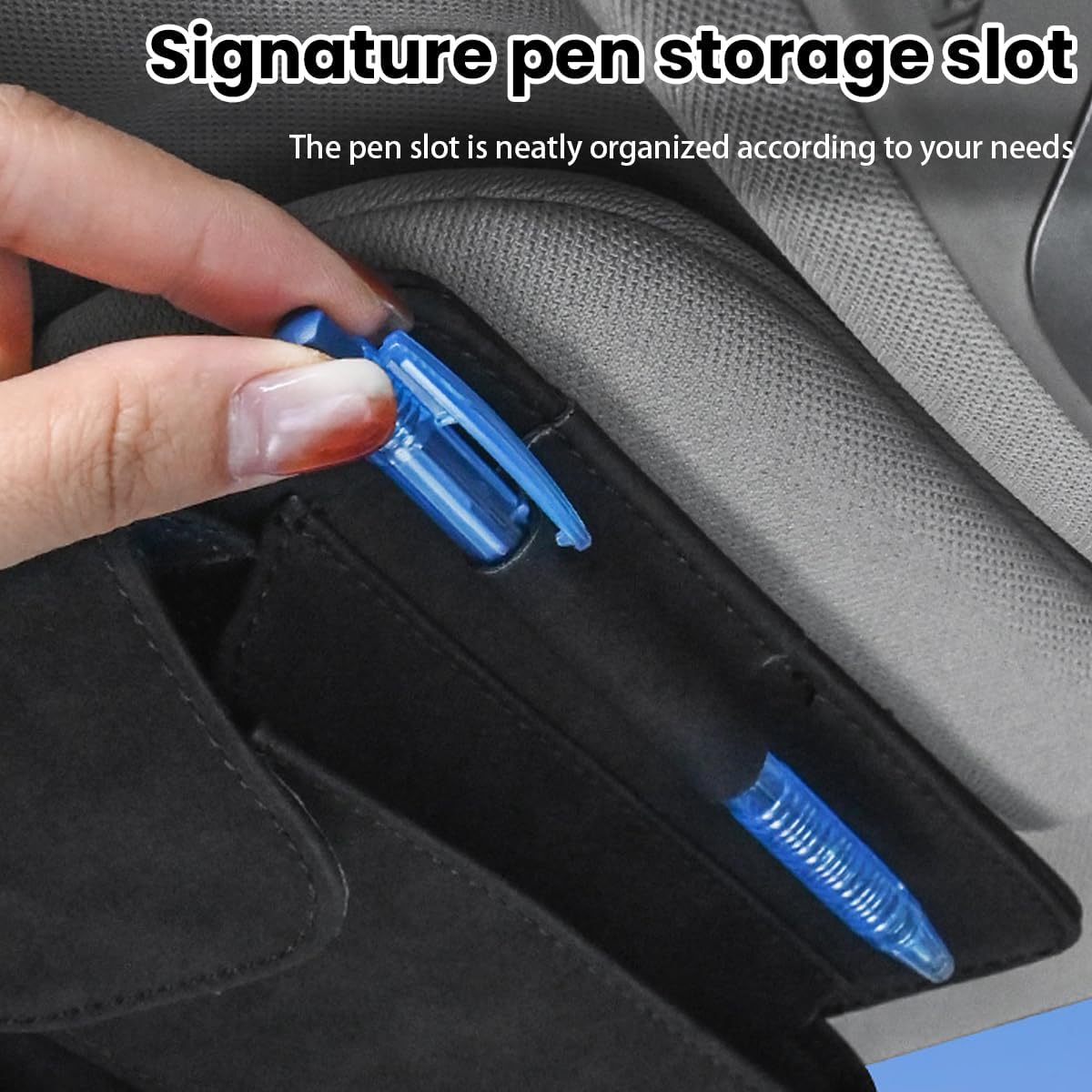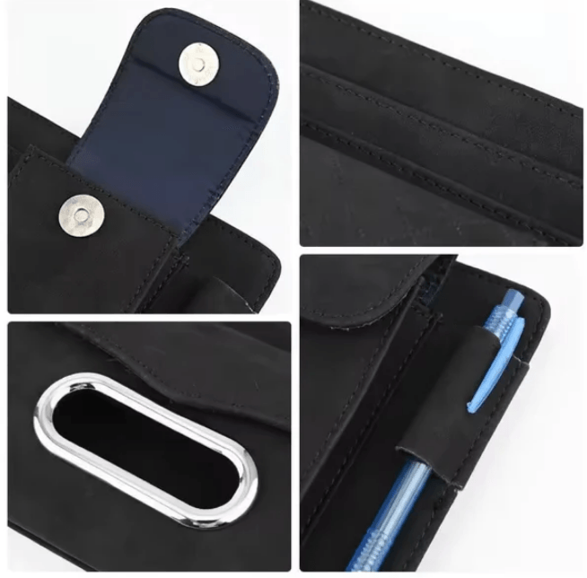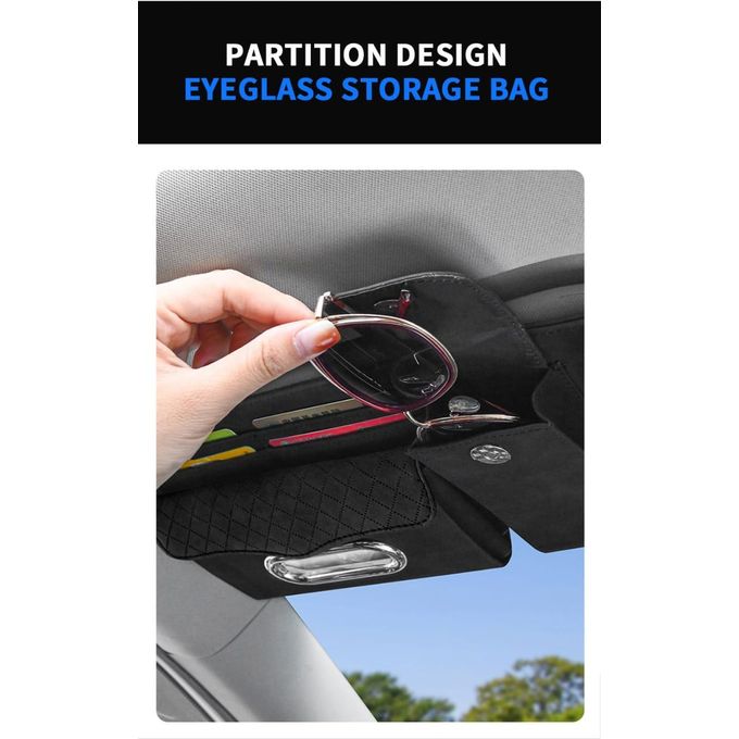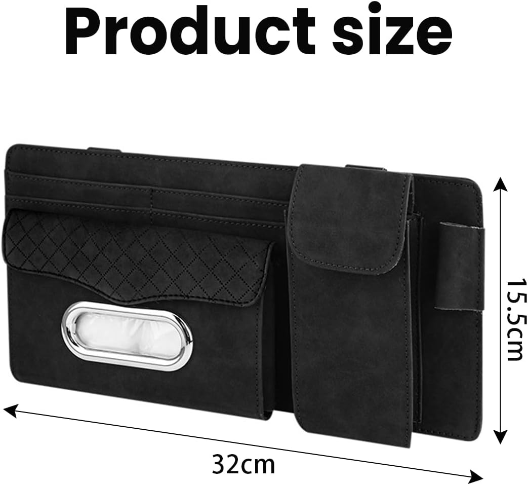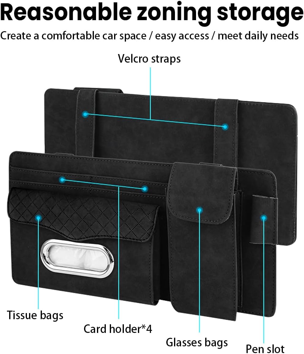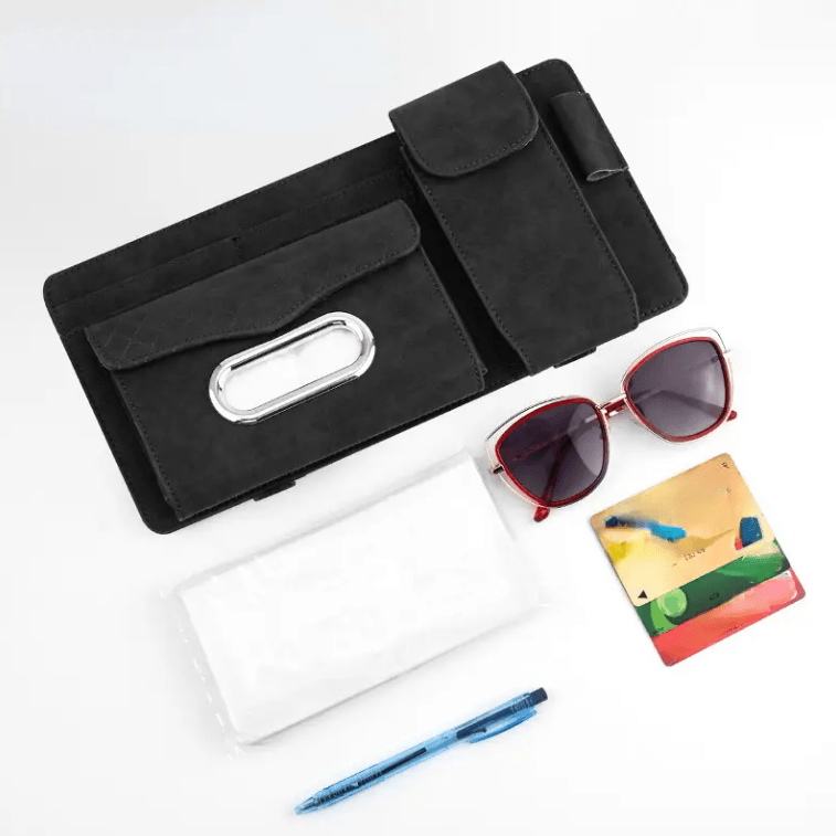 حقيبة منظم واقي الشمس للسيارة باللون الأسود، توفر لك حلاً عملياً وأنيقاً لتنظيم أغراضك اليومية داخل السيارة.