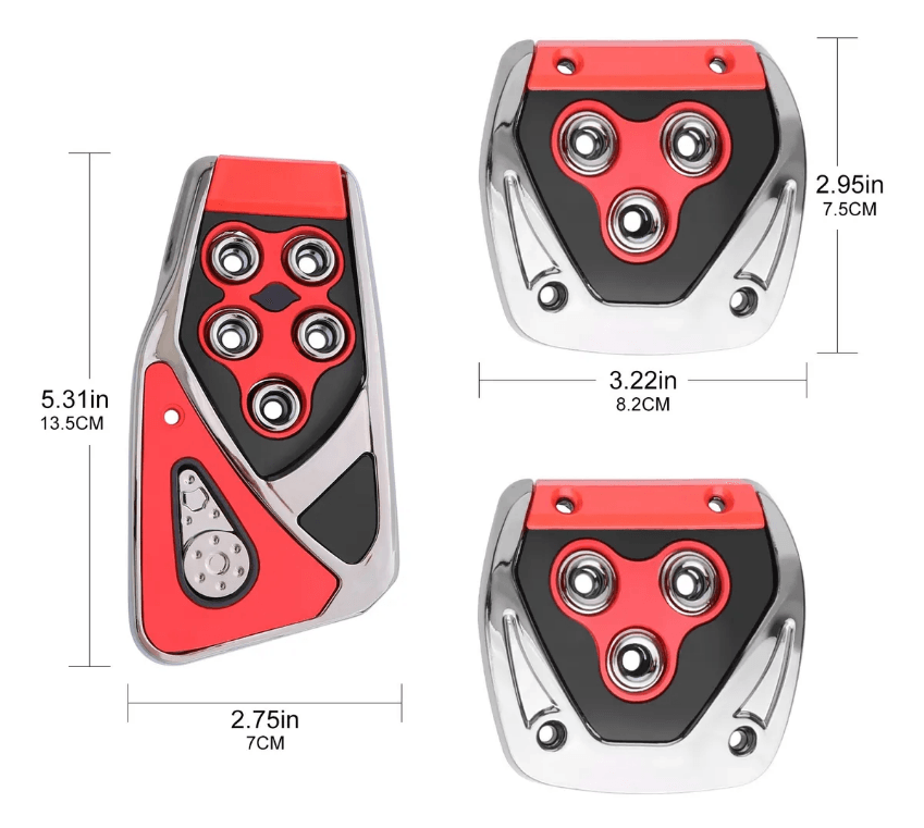 الحجم: دواستان للفرامل/الكلتش (8.2 × 8 سم تقريباً) + دواسة للبنزين (13.5 × 7 سم).