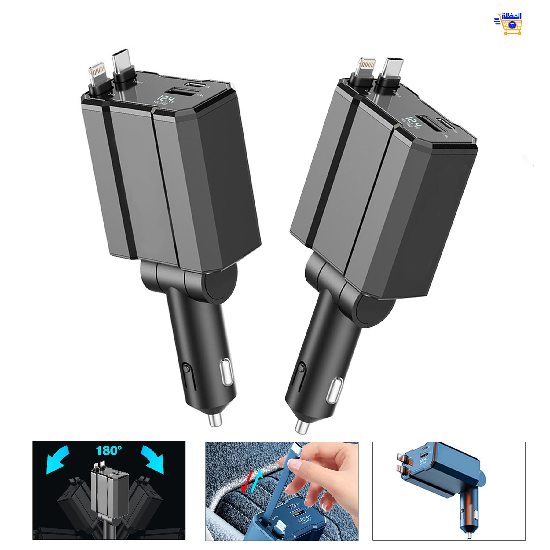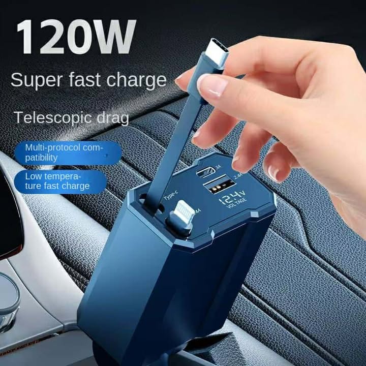 شاحن سيارة قابل للسحب 4 في 1 هو كل ما تحتاجه داخل سيارتك، تصميم مبتكر يجمع بين القوة والراحة، يشحن أجهزتك بأمان وبأقصى سرعة ممكنة، وبدون أي فوضى في الأسلاك بفضل ميزة السحب التلقائي للكابلات.