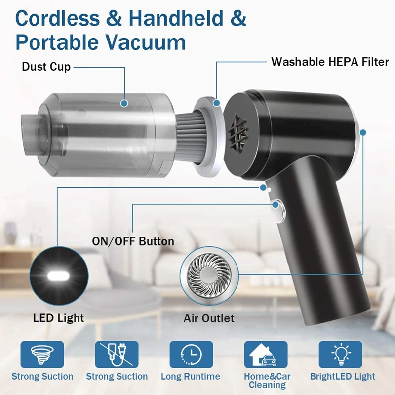 إذا كنت تبحث عن مكنسة كهربائية لاسلكية محمولة متعددة الوظائف خفيفة و عملية و قابلة للشحن, فهذه المكنسة هي الأداة الممتازة لذلك , قابلة لشحن و فيها ضوء LED أخضر عندما تكون مشحونة شحن كامل, عملة في عمليات التنظيف و تصل لأصعب الأماكن في عند التنظيف الأماكن الظيقة , خفيفة الوزن و سهلة الحمل و الأستخدام سريعة في التنظيف ,تتمتص الأتربة و الحصا بشكل جيد يقوم الطرف الأمامي بشفط البقايا بينما يمكن أستخدام و ظعية الدفع من الرأس الخلفي بنفخ الغبار مما يضمن حل تنظيف شامل و مثالي , تحتوي على فلتلر لتصفية الغبار و يمنعه من الوصول للمحرك و فيها قرورة للحفاض على الحصا و الغبار فيها بعيد عن المحرك و يمكن غسلها من الدخال وكليا مقاومة للماء . تأتي أيضا بتصميم مبتكر و معها كامل الملحقات المساعدة في عملية التنظيف و خيط لشحنها.